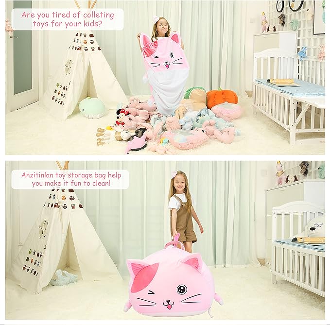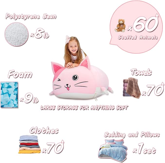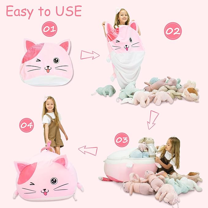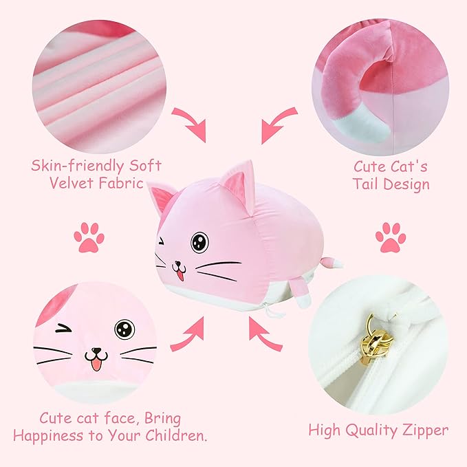 Cute Cat Bean Bag Chair for Kids, Pink Stuffed Animal Storage Beanbag Chairs for Girls Room Decor, Extra Large Size, Velvet Super Soft Cover Only