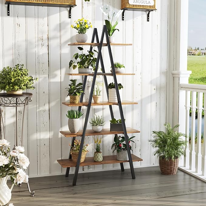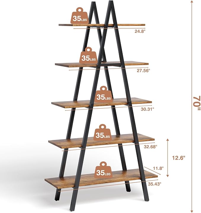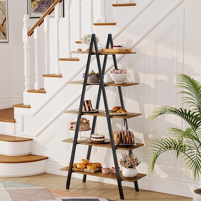 5-Tier Ladder Bookshelf, Industrial A-Shaped Bookcase, Christmas Village Display Stand, Tall Ladder Shelf Storage Organizer for Living Room, Home Office, Black