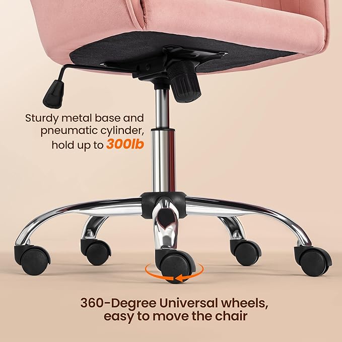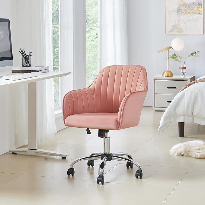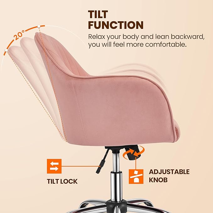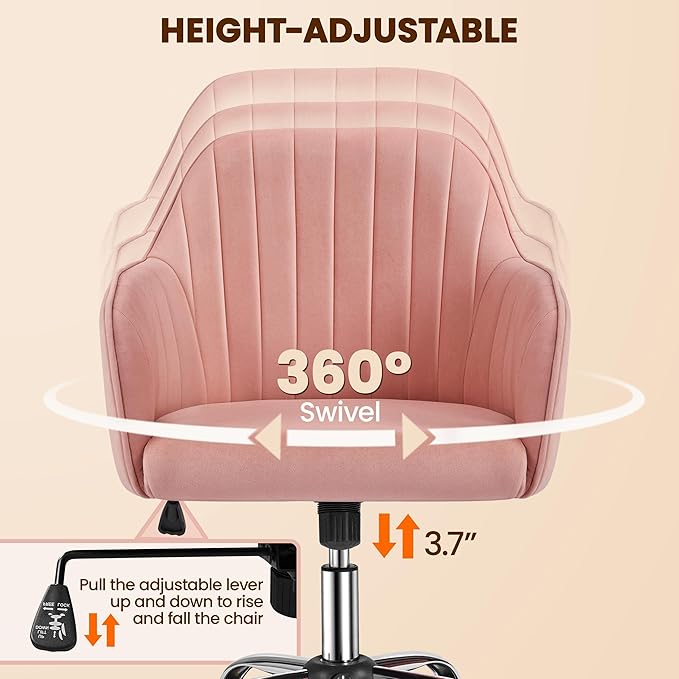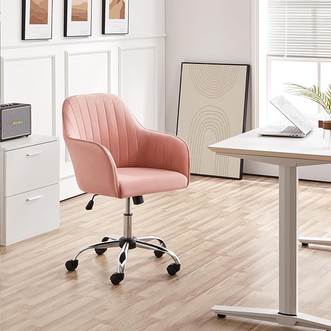Yaheetech Velvet Vanity Chair Makeup Chair Cute Office Chair Aesthetic Desk Chair Height Adjustable Task Chairs 360° Swivel Computer Chair Living Room Chairs with Arms&Stainless Base Accent Pink