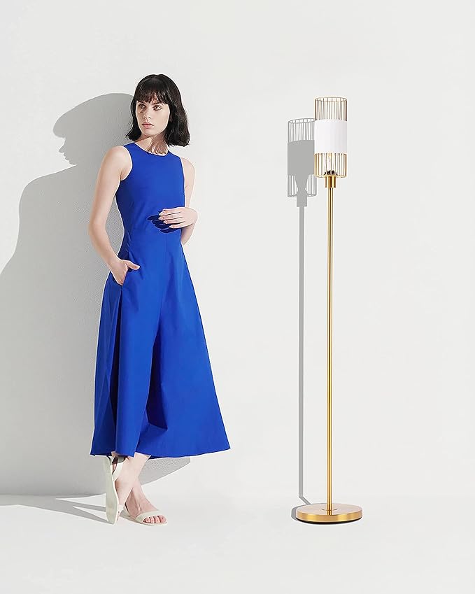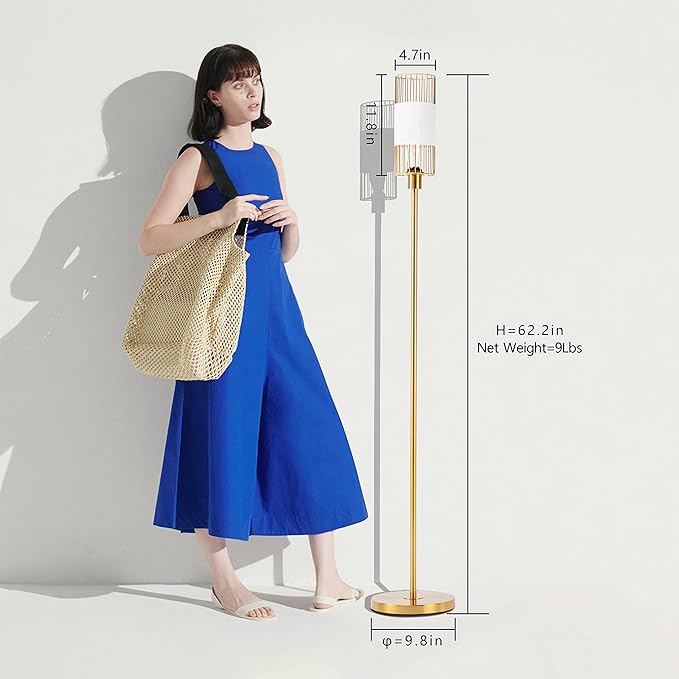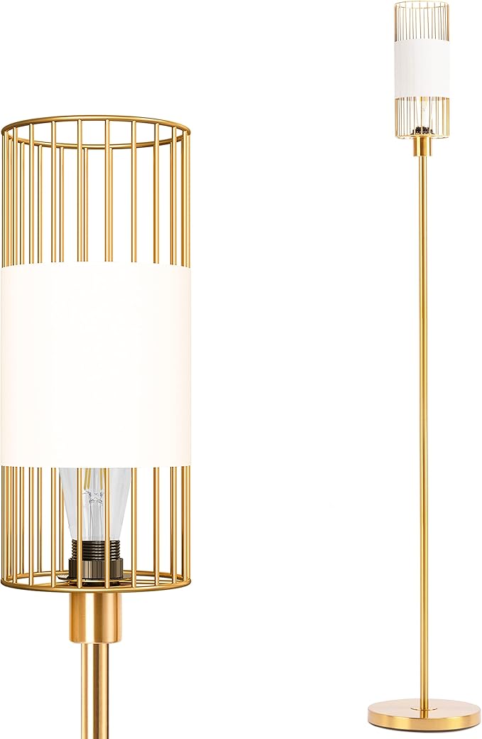 Floor Lamp with Metal Cage Shade & 6W LED Bulb - Indoor Brass Pole Light to Match Living Room or Bedroom in Farmhouse, Vintage, or Rustic Style - Standing, Tall Lighting - Gold