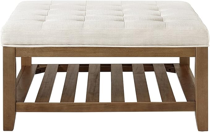 24KF Large Square Upholstered Tufted Linen Ottoman Coffee Table, Large Footrest Ottoman with Solid Wood Shelf-Ivory