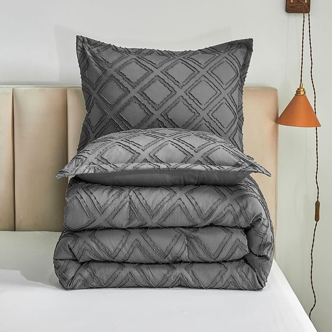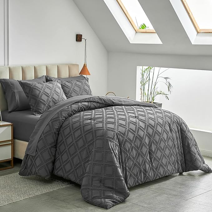 7 Pieces Tufted Bed in a Bag King Comforter Set with Sheets Dark Grey, Soft and Embroidery Shabby Chic Boho Bohemian, Luxury Solid Color with Diamond Pattern, Jacquard Tufts Bedding Set for All Season