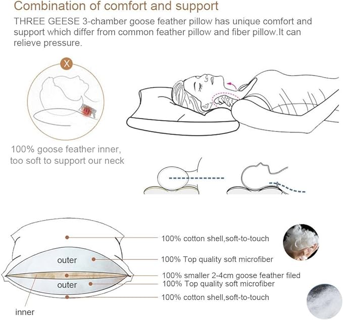 Three Geese Pack of 2 White Goose Feather Bed Pillows King Size - Soft 600 Thread Count 100% Cotton, Medium Firm,Soft Support Surround Fill Polyester, White Solid