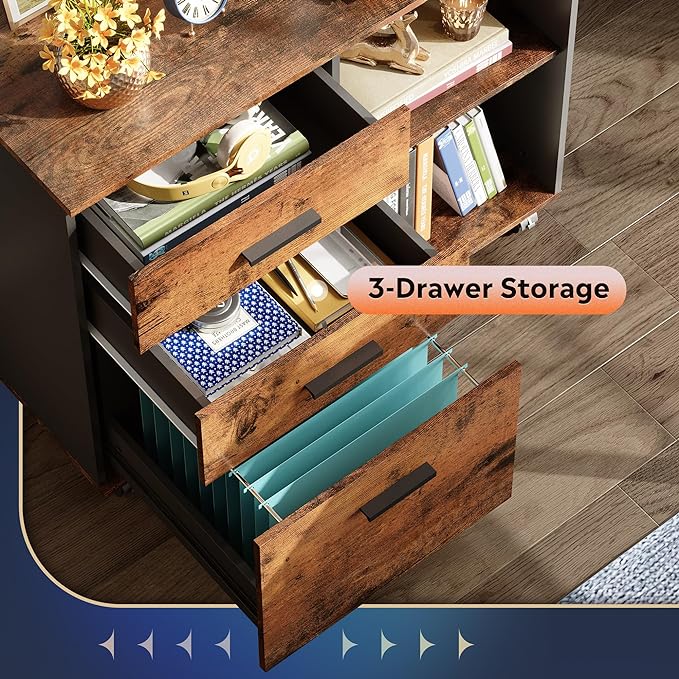DEVAISE 3-Drawer Wood File Cabinet, Mobile Lateral Filing Cabinet, Printer Stand with Open Storage Shelves for Home Office, Rustic Brown