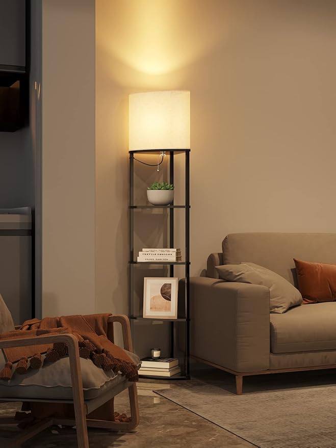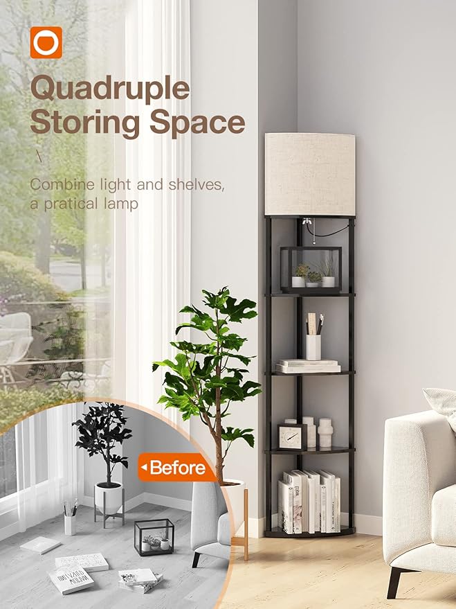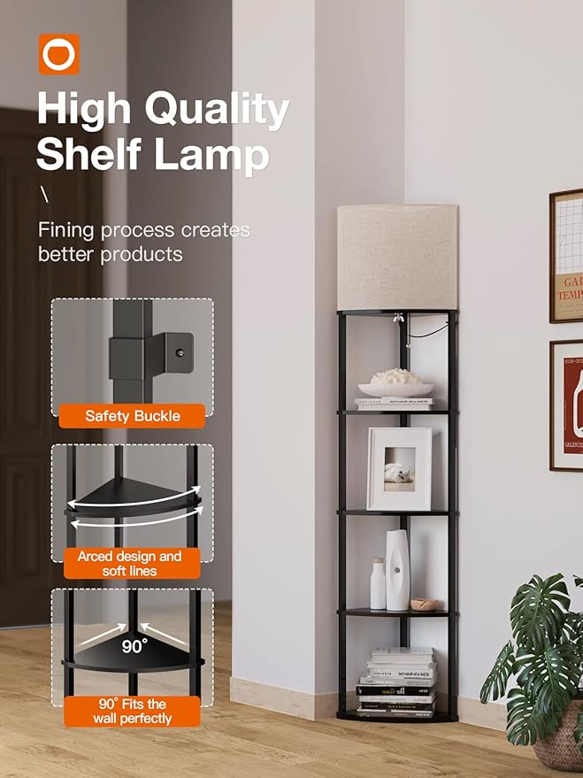 addlon corner lamp 5-Tier Shelf Floor Lamp Display with 3 Color Temperatures LED Bulb and Linen Lamp Shade, Shelves for Living Room, Bedroom and Office - Black