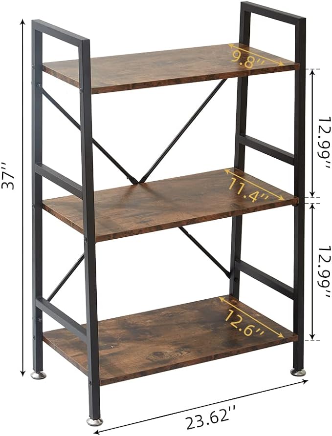 TooCust 3 Tier Bookshelf, 37" x 23" x 12.6", 3 Tier Bookcase, 3 Shelf Bookshelf, Vintage Standing Metal Frame Book Shelves, Small Bookshelf, Rustic Brown