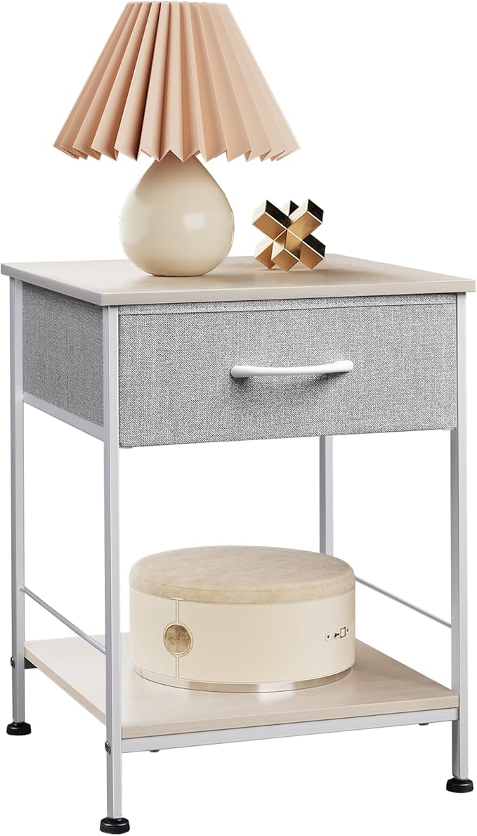 WLIVE Nightstand, End Table with Fabric Storage Drawer and Open Wood Shelf, Bedside Furniture with Steel Frame, Side Table for Bedroom, Dorm, Easy Assembly, Light Grey