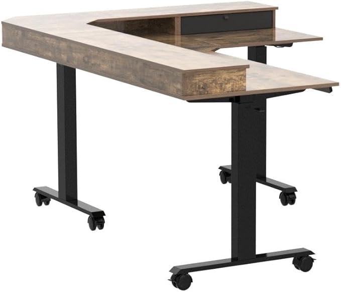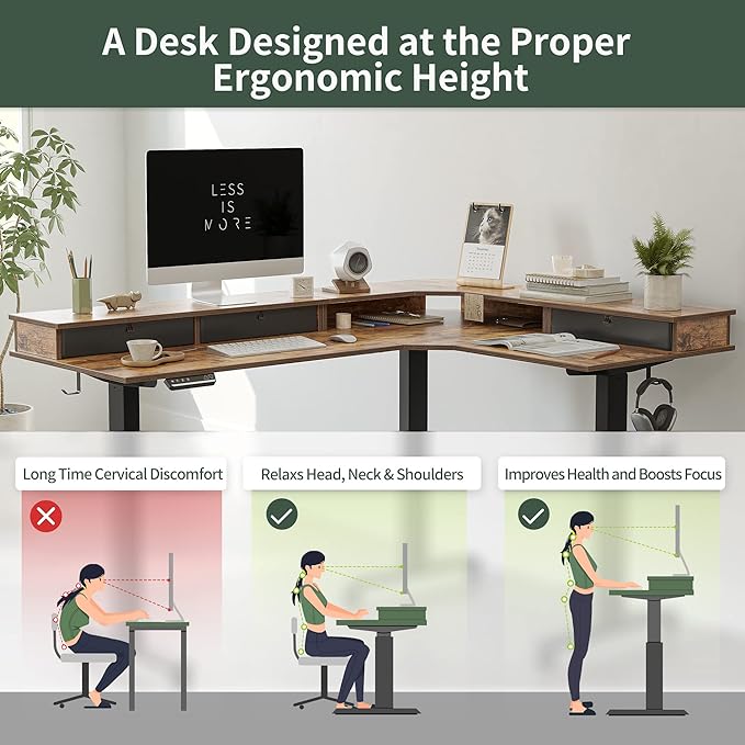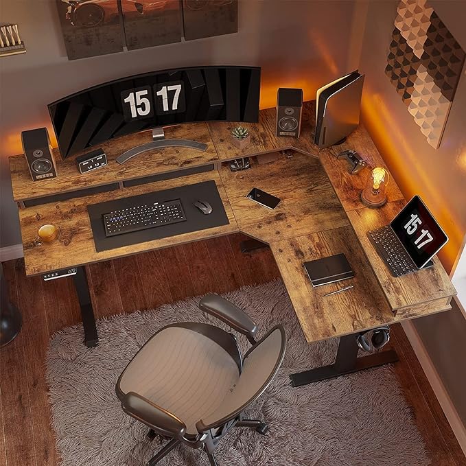 FEZIBO Triple Motor 63" L Shaped Standing Desk with 3 Drawers, Electric Standing Desk Adjustable Height, Corner Stand up Desk with Splice Board - Rustic Brown