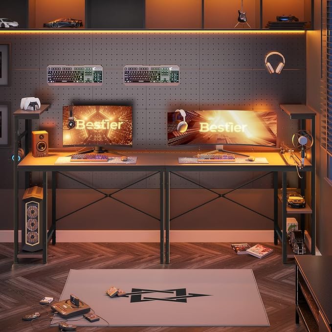 Bestier Gaming Desk with LED Lights, 44 Inch PC Gamer Desk for Small Spaces, Computer Desk with Reversible Storage Shelves & Side Storage Bag (Black Grained)