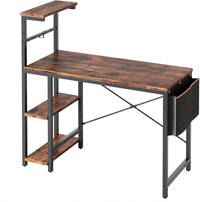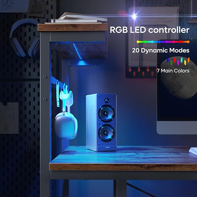Bestier Computer Desk with LED lights, Gaming Desk with 4 Tier Shelves, 44 Inch Office Desk with Storage Bag & Printer Shelf (Rustic Brown)