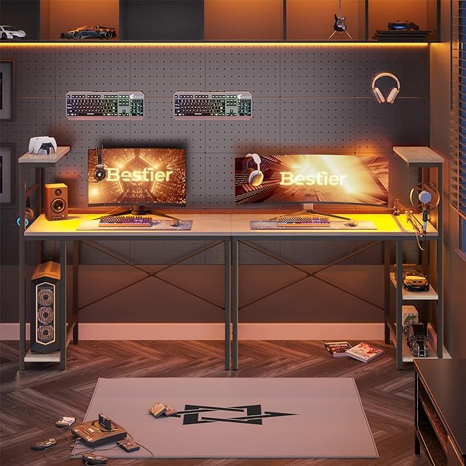 Bestier Computer Desk with 4 Tiers Shelves, Gaming Desk with LED lights, 44 Inch Office Desk with Storage Bag & Printer Shelf (Retro Grey Oak)