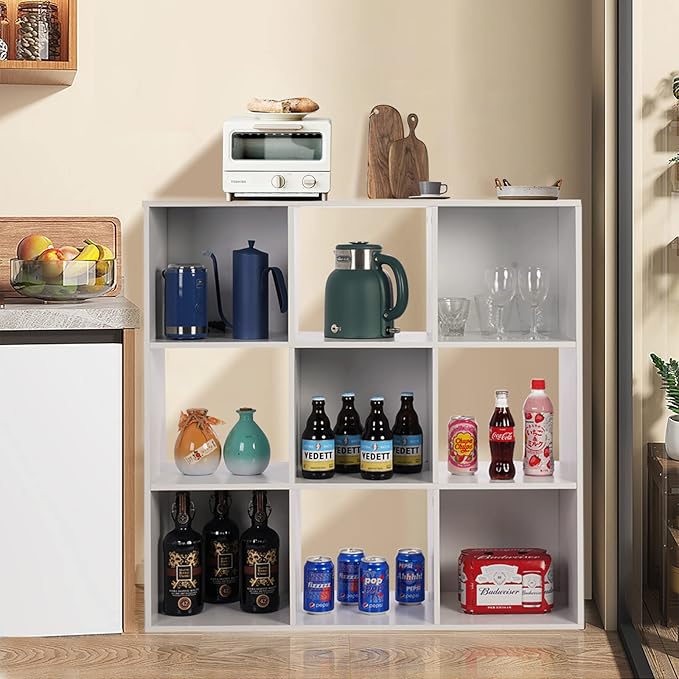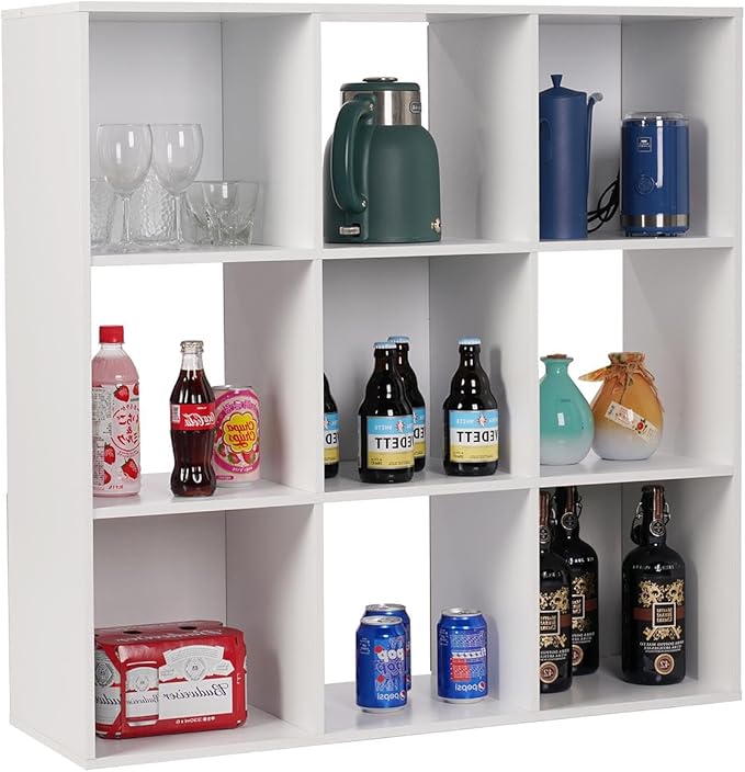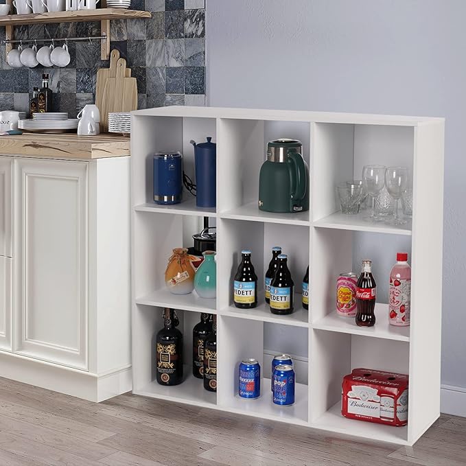 PACHIRA US Open Shelf Bookcase, 9 Cube White Storage Organizer Wood Display Shelf, Free Standing Cubby Bookcase Cabinet Divider Bookshelf Fits 11“ Storage Bin