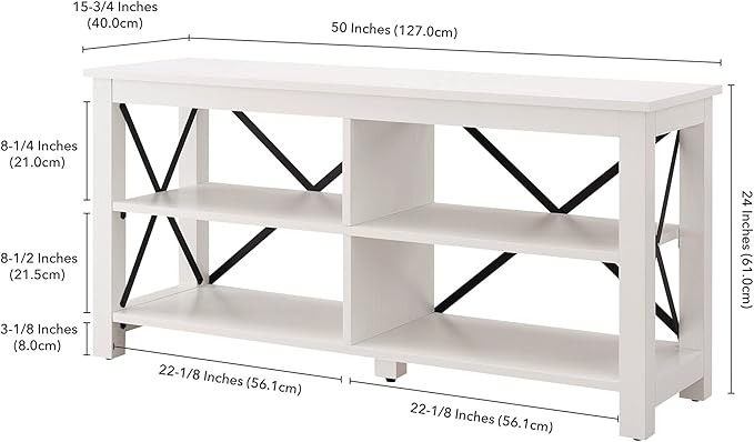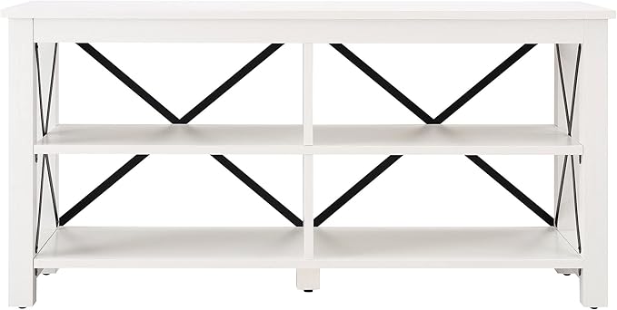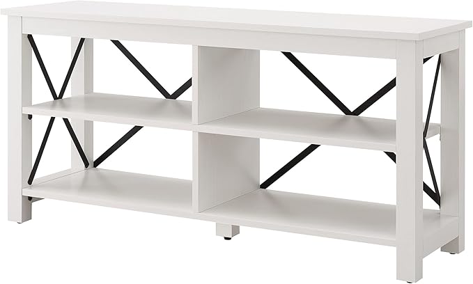 About This Accommodates TVs up to 55". Finished in white. The top has a weight capacity of 75 lbs. Lower...