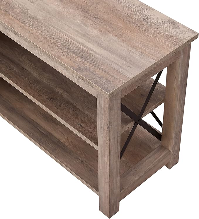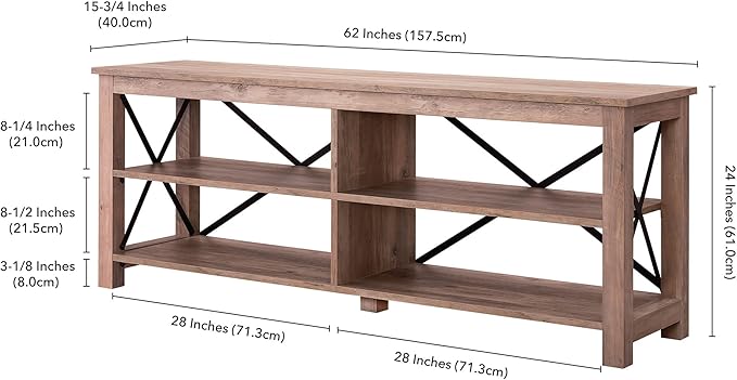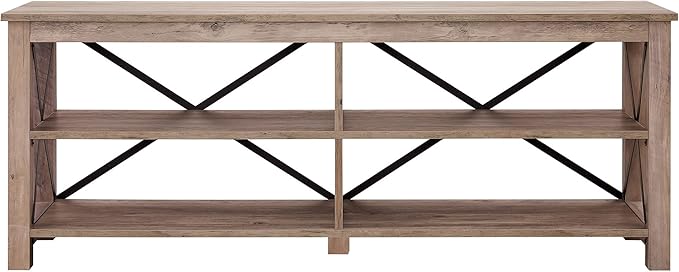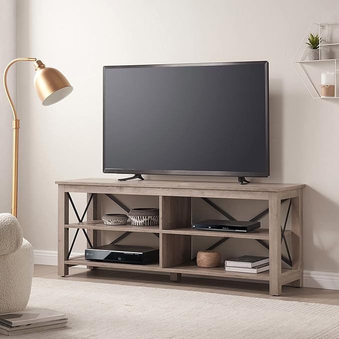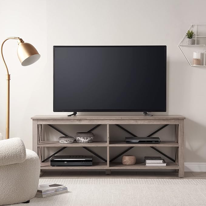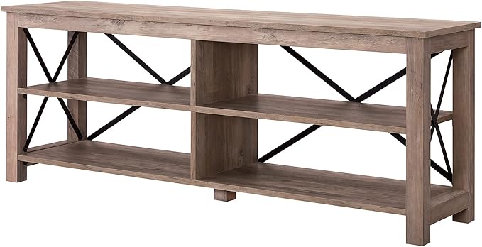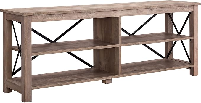 About This Accommodates TVs up to 70" Finished in gray oak with black metal accents. The top has a weight...