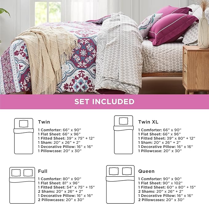 Degrees of Comfort Twin Complete Comforter Sets, Lattice Boho Bed in A Bag,Microfiber Bedding Set with Side Pockets, Matching Decorative Pillow, 6 Piece Purple