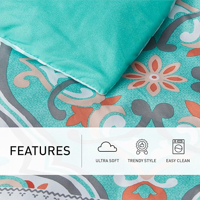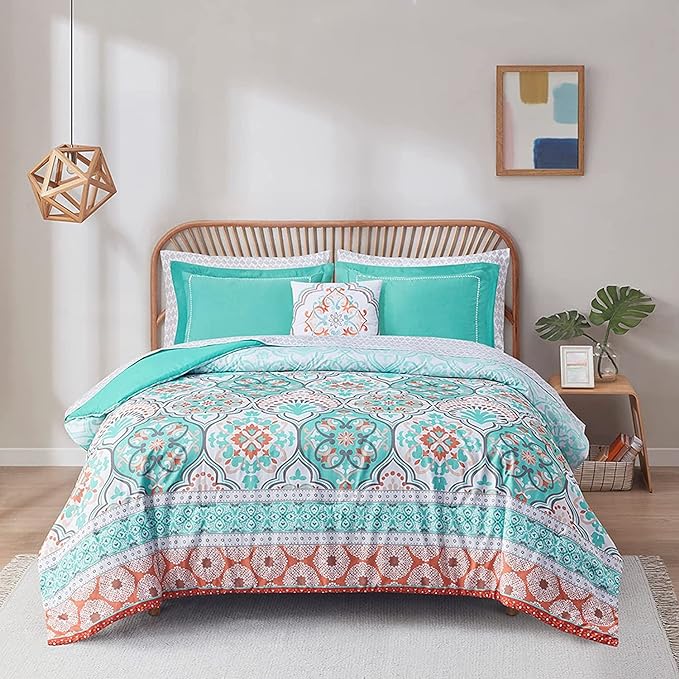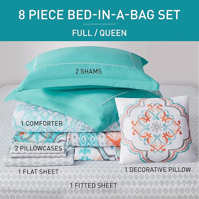 Degrees of Comfort Full Size Comforter Sets with Sheets Floral, Aqua Boho Complete Bedding Set for teen girls, Microfiber 8 Piece Bed in a Bag with Side Pockets, Matching Decorative Pillow