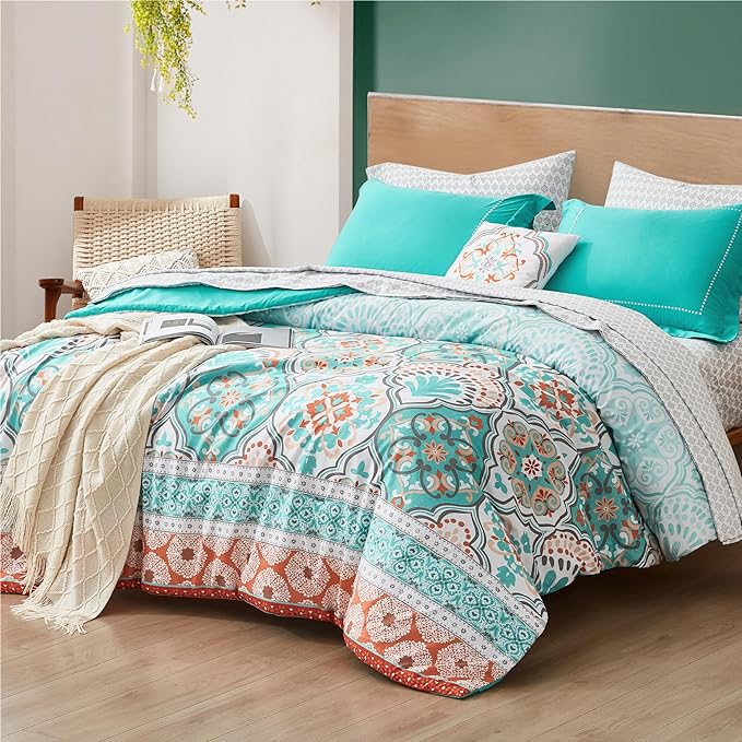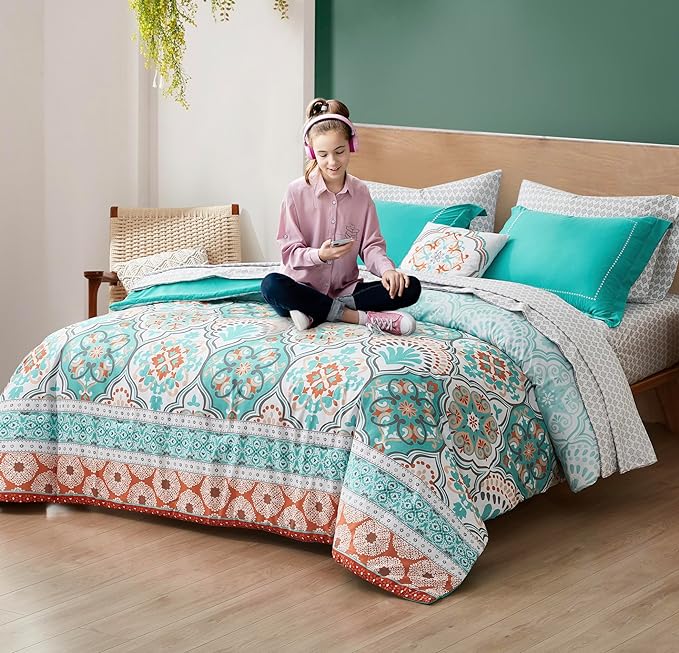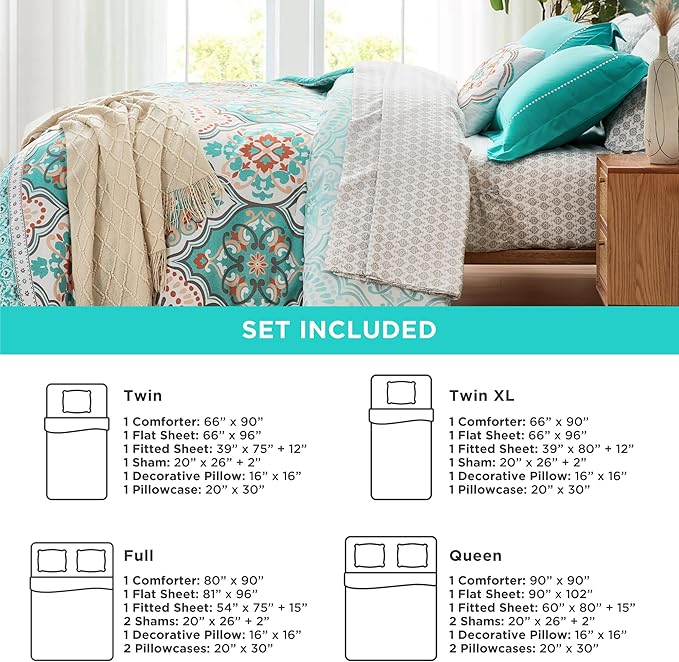 Degrees of Comfort Twin Bed in A Bag 6 Piece, Lattice Boho Bedding Sets for Teen Girls, Aqua Floral Bed Set, Microfiber Colorful Comforter Set with Sheets, Matching Decorative Pillow