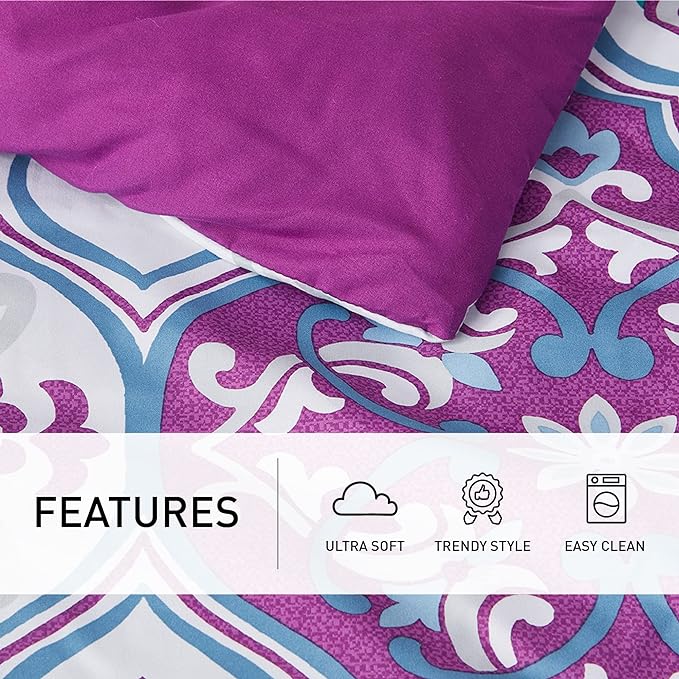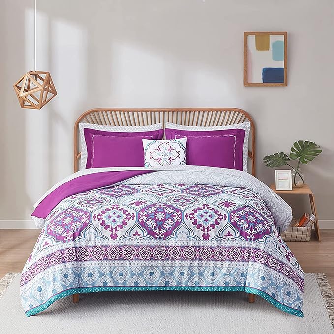Degrees of Comfort Full Size Complete Comforter Sets, Lattice Boho Bed in A Bag,Microfiber Bedding Set with Side Pockets, Matching Decorative Pillow, 8 Piece Purple