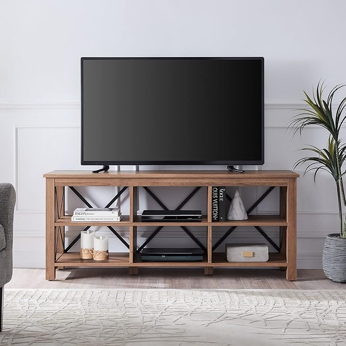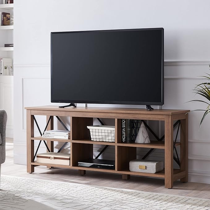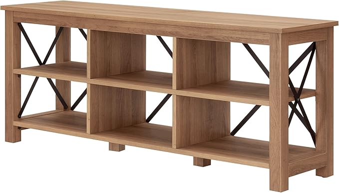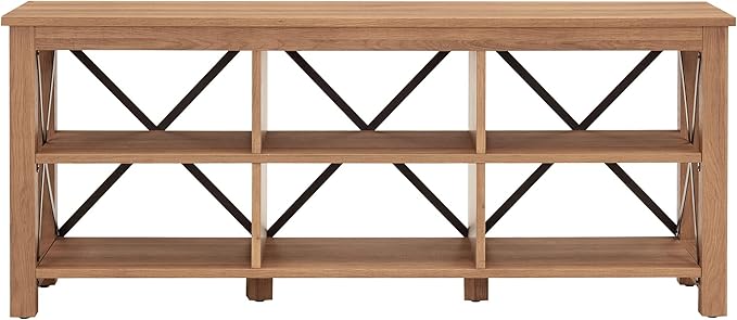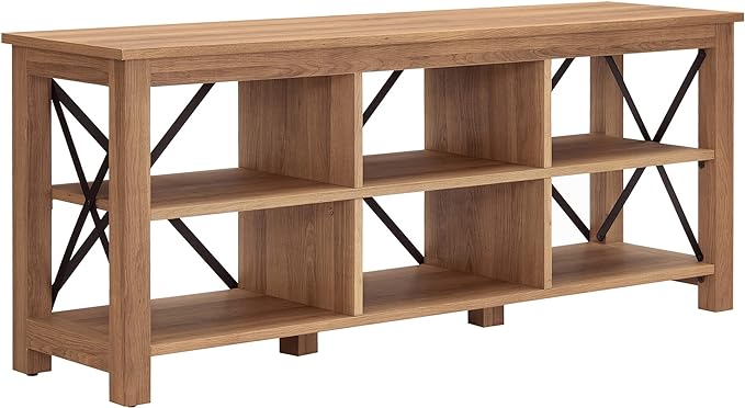 About This Accommodates TVs up to 65" Finished in golden brown with black metal accents. Crafted from durable MDF wood...