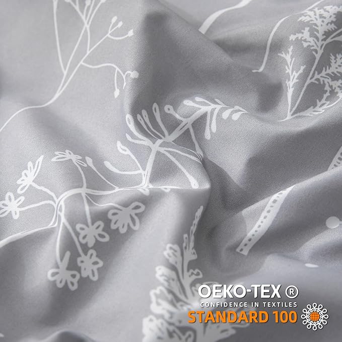 JANZAA 3PCS King Comforter Floral Comforter Set Bedding Set White Flower Printing on Gray Comforter with 2 Pillow Cases for All Season Using