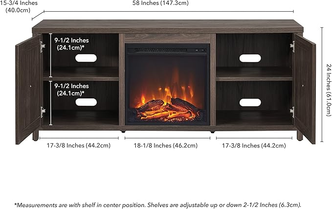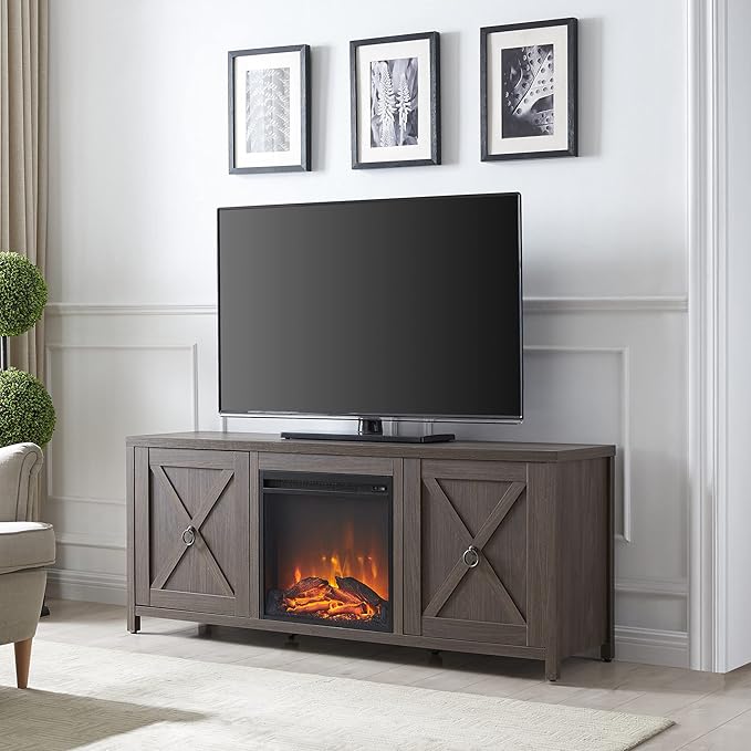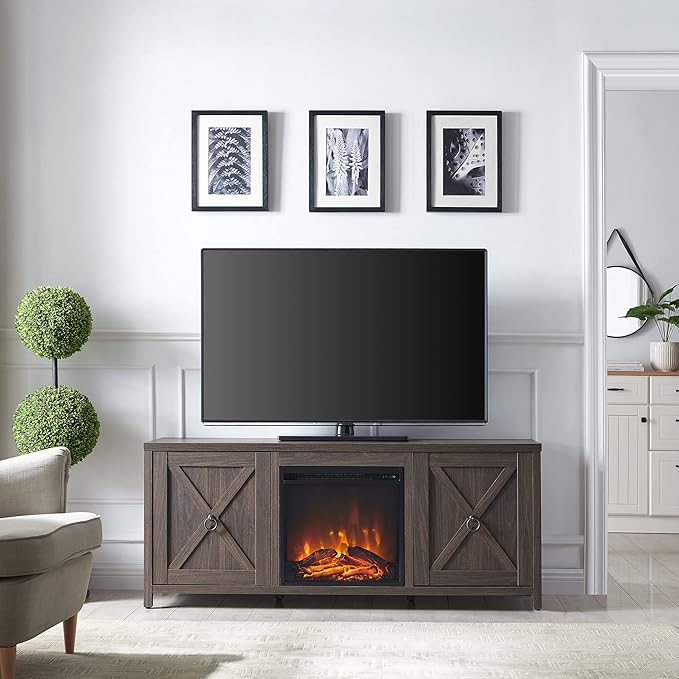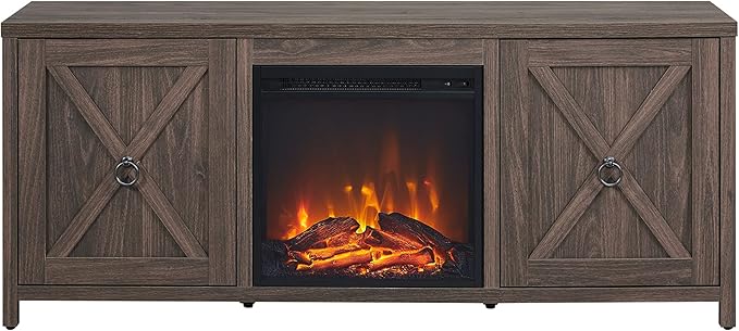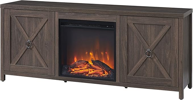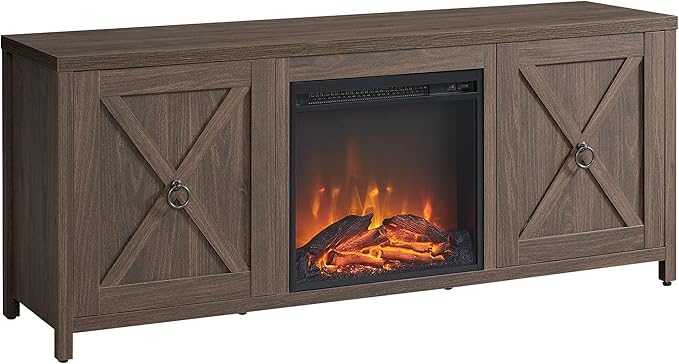 About This Mdf Accommodates TVs up to 65" Features an electric fireplace insert with wood-look logs and LED faux-flames. Fireplace...