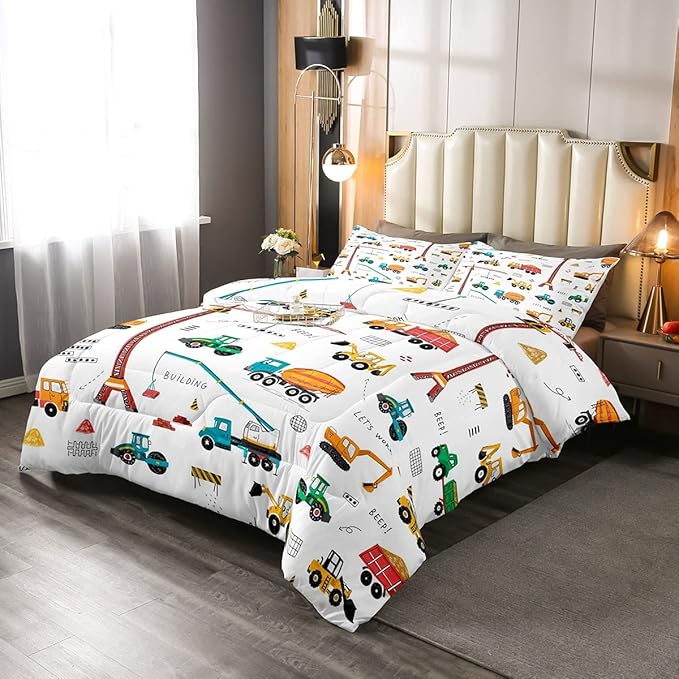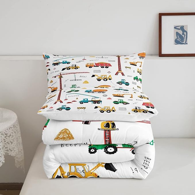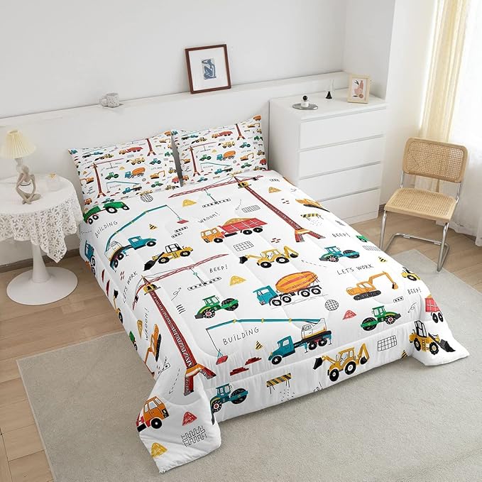 Heavy Machinery Truck Bedding Set Tractor Crane Comforter Set for Kids Boys Girls Youth Construction Site Comforter Nursery Decor Quilt Set Room 3Pcs Full Size