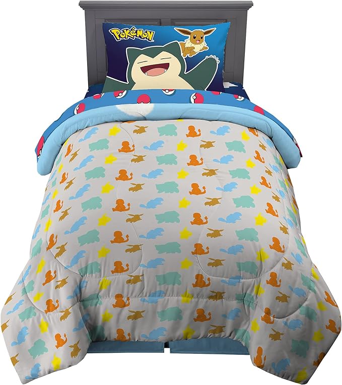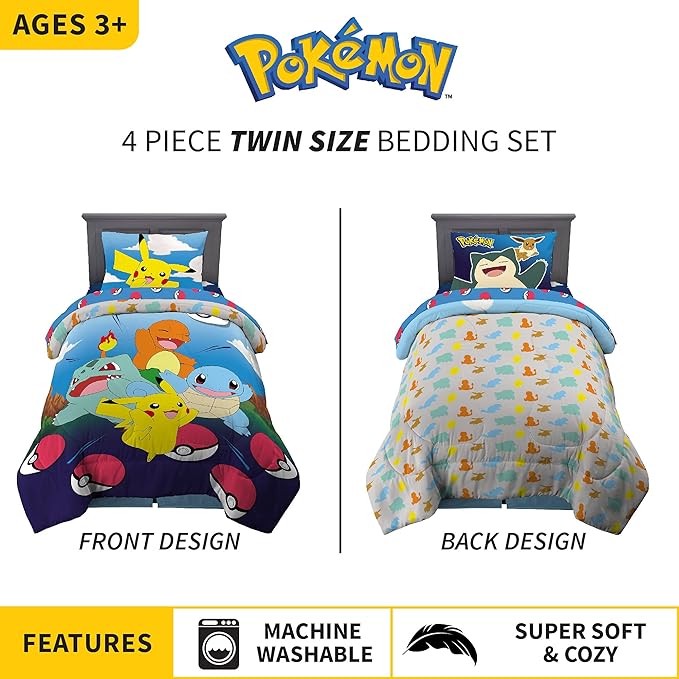 Franco Kids Bedding Super Soft Comforter and Sheet Set, 4 Piece Twin Size, Pokemon (Prints May vary)