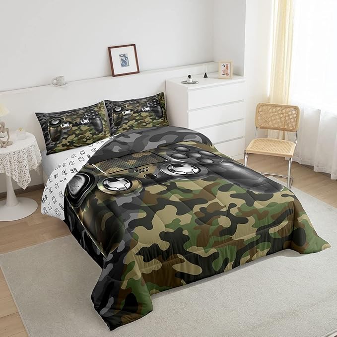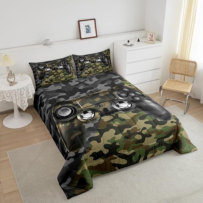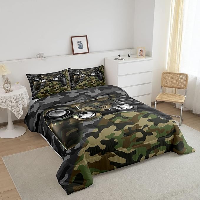 Feelyou Kids Gamer Comforter Set Camouflage Gaming Bedding Set for Boys Teens Bedroom Green Black Camo Video Game Decor Comforter Gamer Console Quilt Set Twin Size Duvet Quilted 2Pcs