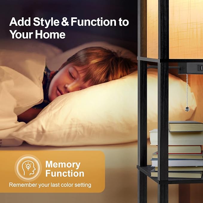 OUTON Floor Lamp with Shelves, Dimmable Shelf Floor Lamp with Remote, 1USB & 1 Type C Ports, 1 Power Outlet, Modern Standing Lamp with 4 Color Temperature for Living Room, Bedroom, Matte Black