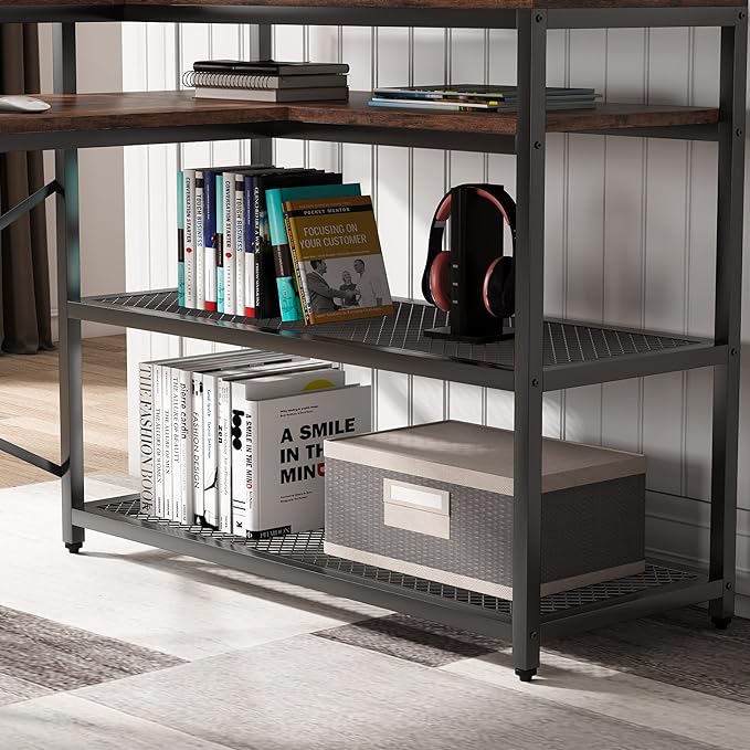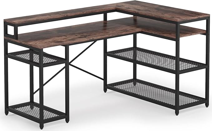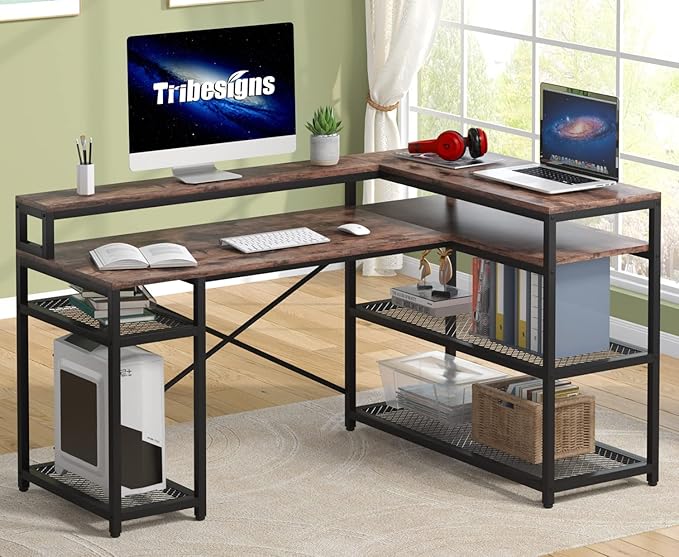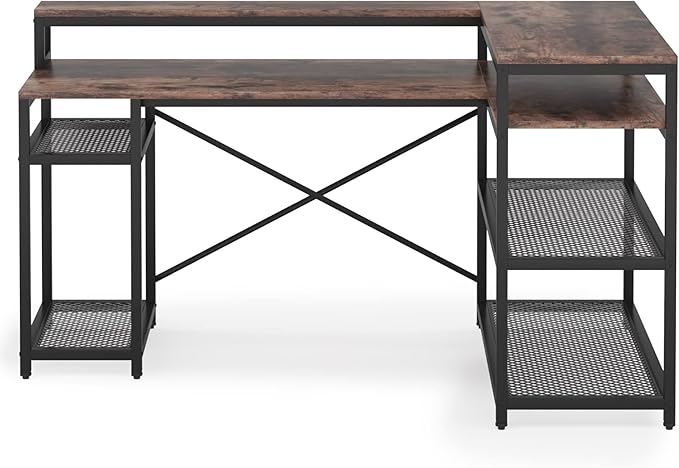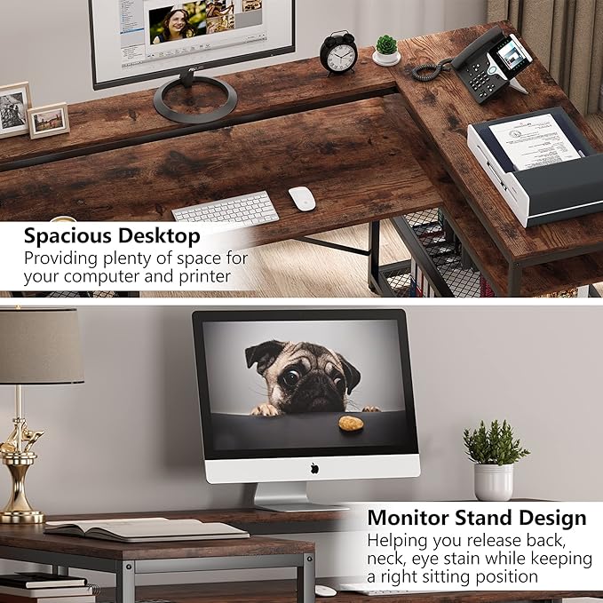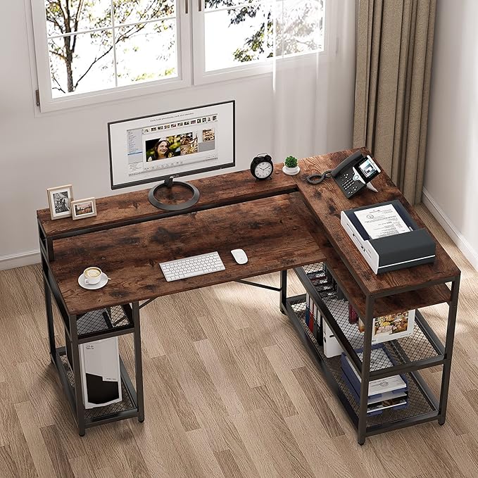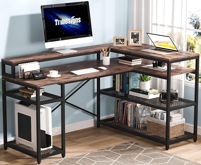 Tribesigns L Shaped Desk with Storage and Monitor Stand, Industrial Home Office Computer Desk with Storage Shelves, 59 Inch Corner Desk with Monitor Shelf(Brown)