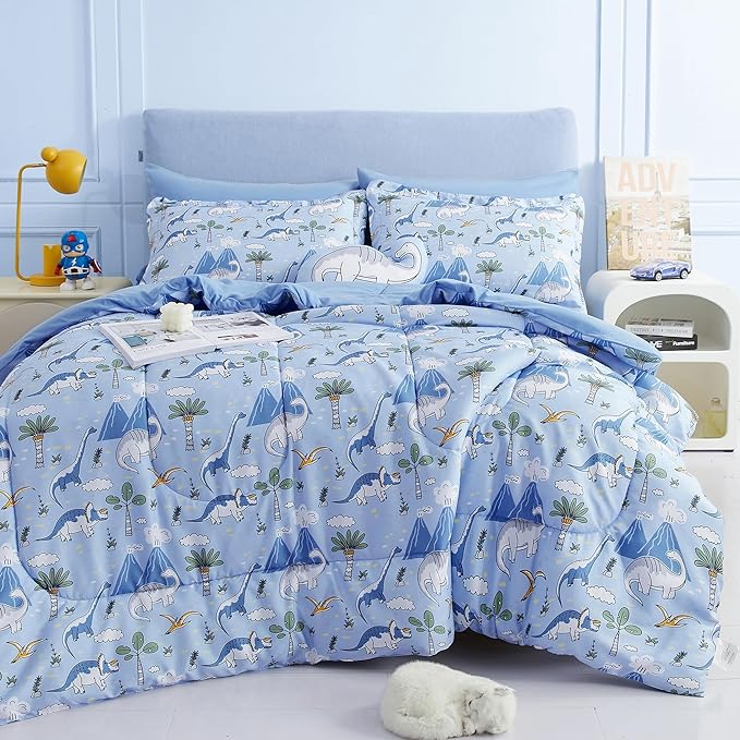 Mooreeke Kids Comforter Bed Set Twin Size for Boys, 6 Pieces Bed in a Bag with Shams, Sheet Set and 1 Decorative Toy Throw Pillow, Dinosaur Blue Super Twin Soft Microfiber Kids Comforter Bedding Set