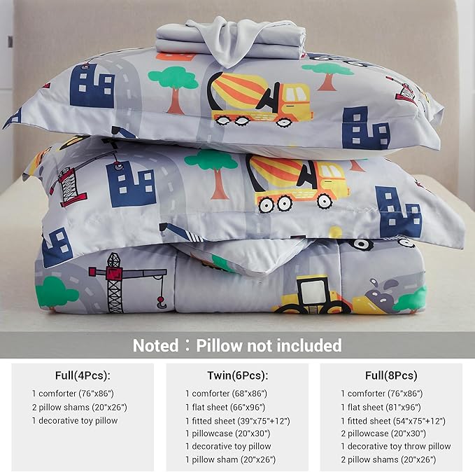 Mooreeke Bed in a Bag for Kids Boys Teens, 6 Pieces Twin Size Comforter Bed Set with Shams, Sheet Set and Decorative Toy Pillow, Excavator Super Soft Microfiber Kids Comforter Bedding Set