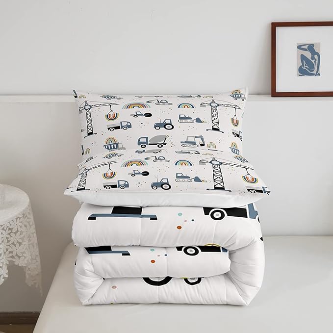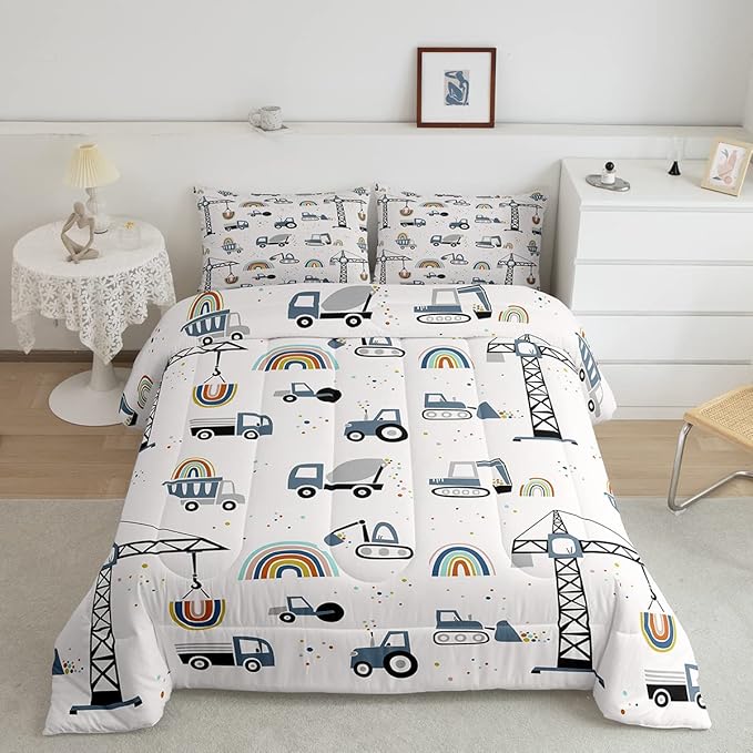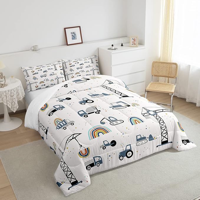 Toddler Cute Cars Bedding Set Cartoon Excavator Kids Comforter Set Boys Construction Vehicles Comforter Equipment Trucks Duvet Set Rainbow Room Decor Tractor Quilt Set Queen Size With 2 Pillow Case