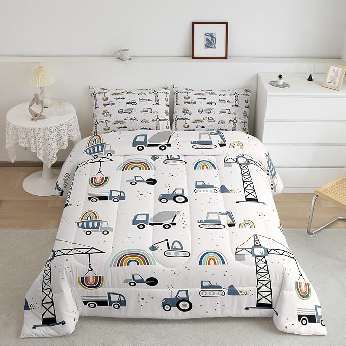 Toddler Cute Cars Bedding Set Cartoon Excavator Kids Comforter Set Boys Construction Vehicles Comforter Equipment Trucks Duvet Set Rainbow Room Decor Tractor Quilt Set Twin Size With 1 Pillow Case