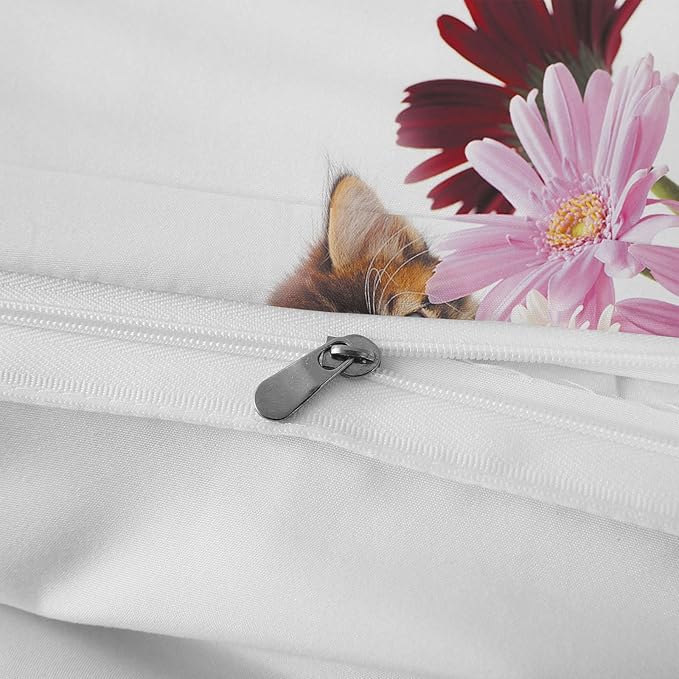 Cat Comforter Set Queen Size for Kids Pink Flowers Cats 3Pcs Bedding Set for boys and Girls (1Summer Comforter+ 2 Pillowcases) Lovely Animal Pets Duvet Set