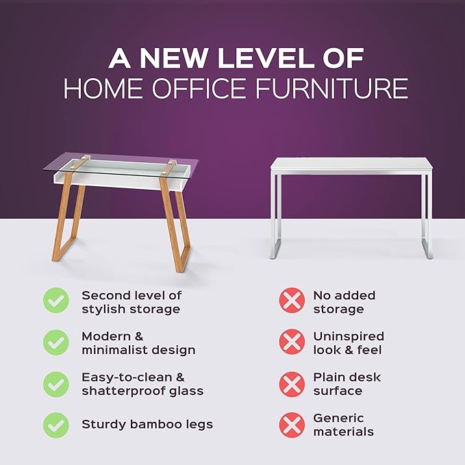 bonVIVO Massimo Small Desk - 47 Inch, Modern Computer Desk for Small Spaces, Living Room, Office and Bedroom - Study Table w/Glass Top and Shelf Space - Black