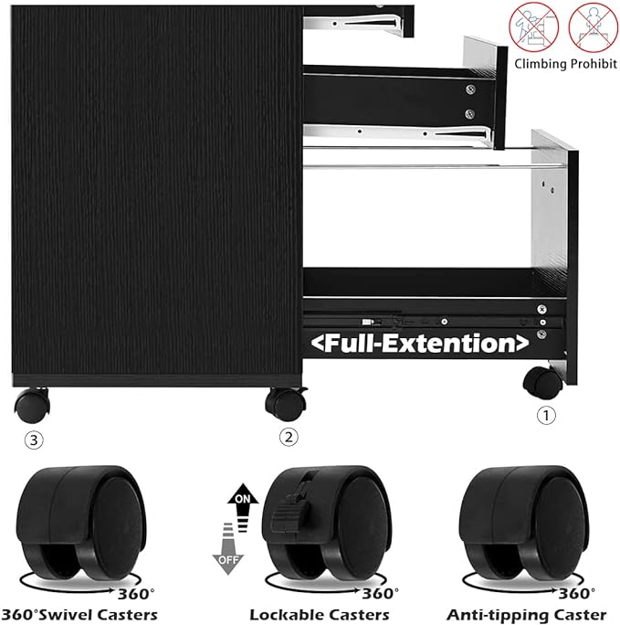 Panana 3 Drawer Wood Mobile File Cabinet, Under Desk Storage Drawers Small File Cabinet for Home Office (Black)
