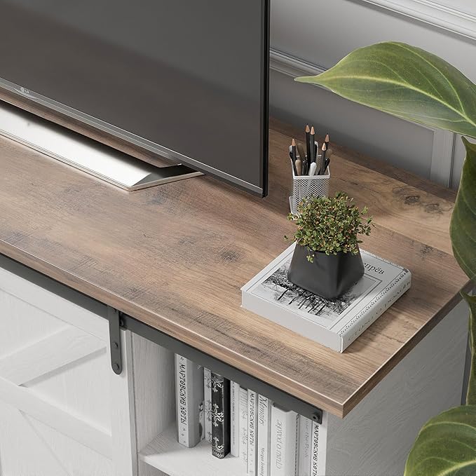 YESHOMY Farmhouse TV Stand and Entertainment Center for Televisions up to 65 Inchs, with Sliding Barn Doors and Storage Cabinets, Console Table and Media Furniture for Living Room, 58 Inch, White