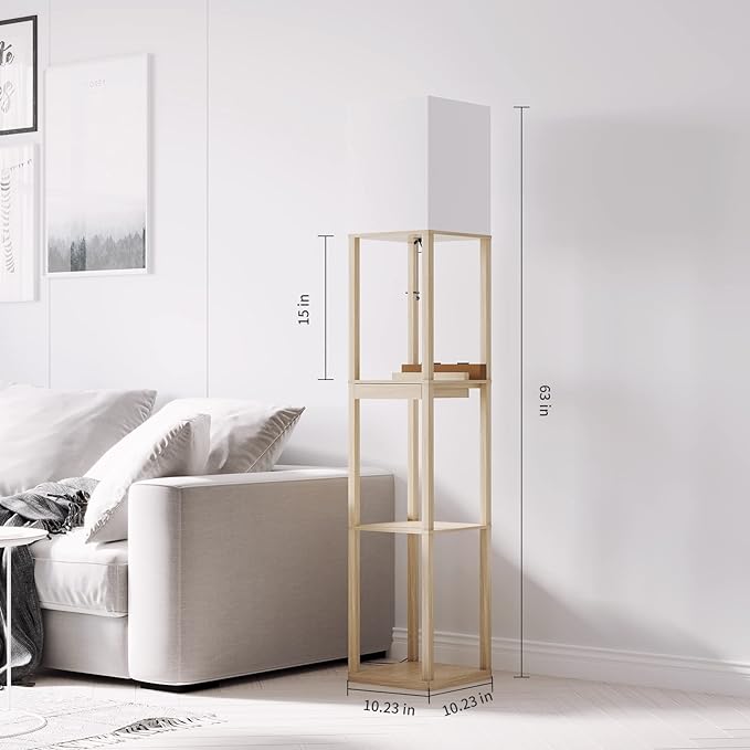 SUNMORY Floor Lamp with Shelves,Modern Dimmable Wood Standing Lamp with 1 Drawer and 2 USB Ports & 2 Power Outlet,Corner Tall Bookshelf Lamp for Living Room and Bedroom(Wood Color)
