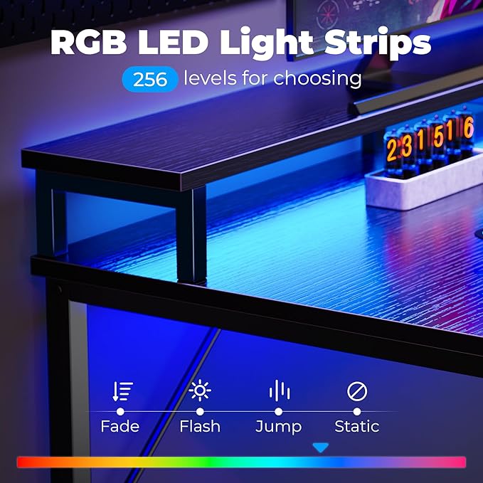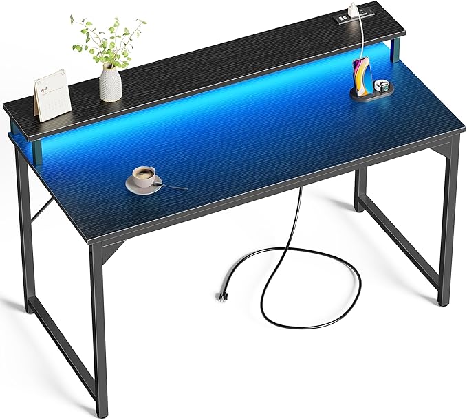 SUPERJARE 47 inch Computer Desk with LED Lights & Power Outlets, Home Office Desk with Monitor Shelf, Small Desk for Home & Office, Black