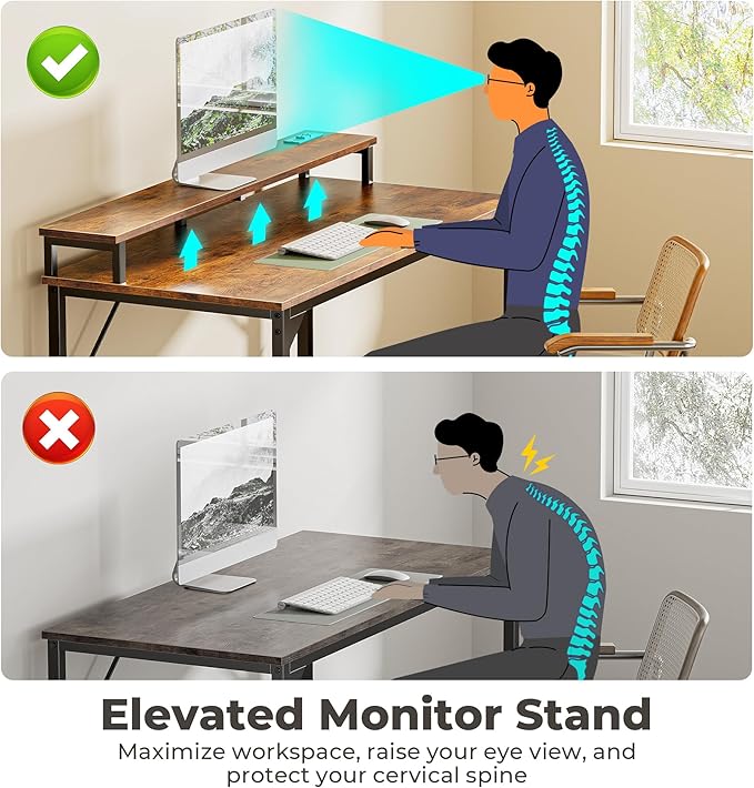 SUPERJARE 47 inch Computer Desk with LED Lights & Power Outlets, Home Office Desk with Monitor Shelf, Small Desk for Home & Office, Rustic Brown