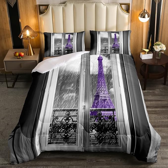 Erosebridal Purple Eiffel Tower Comforter Set Full,vintage France Paris Bedding Set for Girls Teens Women Retro City Building Down Comforter Romantic Rainy Day Quilt Set 2 Pillow Cases Bedroom Decor