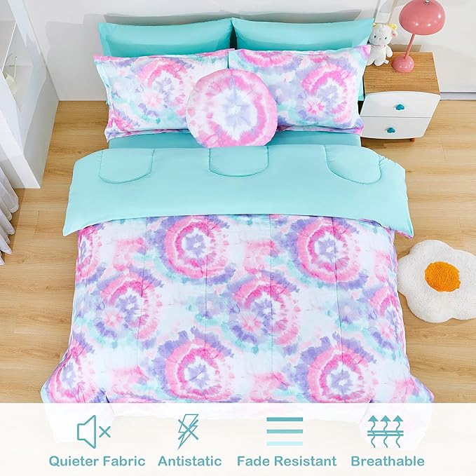 Mooreeke Tie Dye Kids Comforter Bed Set Twin Size for Girls, 6 Pieces Bed in a Bag with Shams, Sheet Set, A Toy Pillow Dark Pink Round Flower Twin Soft Microfiber Kids Comforter Bedding Set