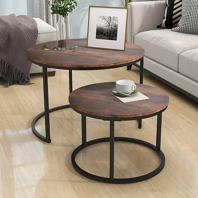 Industrial Round Coffee Table Set of 2 End Table for Living Room,Stacking Side Tables, Sturdy and Easy Assembly,Wood Look Accent Furniture with Metal Frame,Black+Rustic Brown