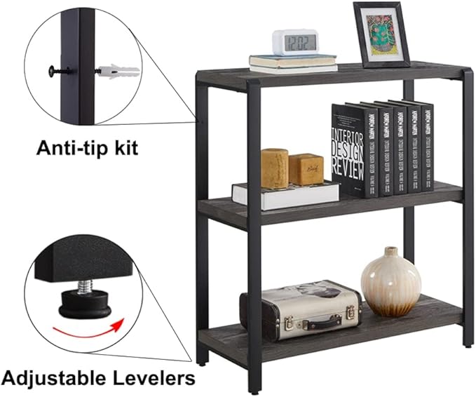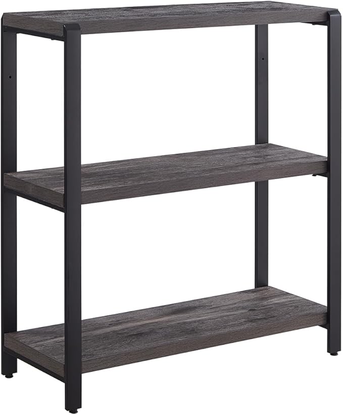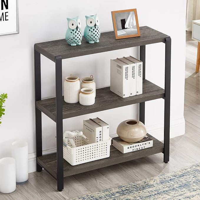 Bookshelf and Bookcase, 3 Tier Vintage Shelf for Office, Rustic Wood and Metal Book Shelves, Grey