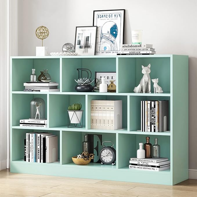 IOTXY Open Shelf Low Bookcase - Wooden 3-Tier Floor Standing Display Cabinet Organizer with Base, 10 Cubes Short Horizontal Bookshelf in Tiffany-Green