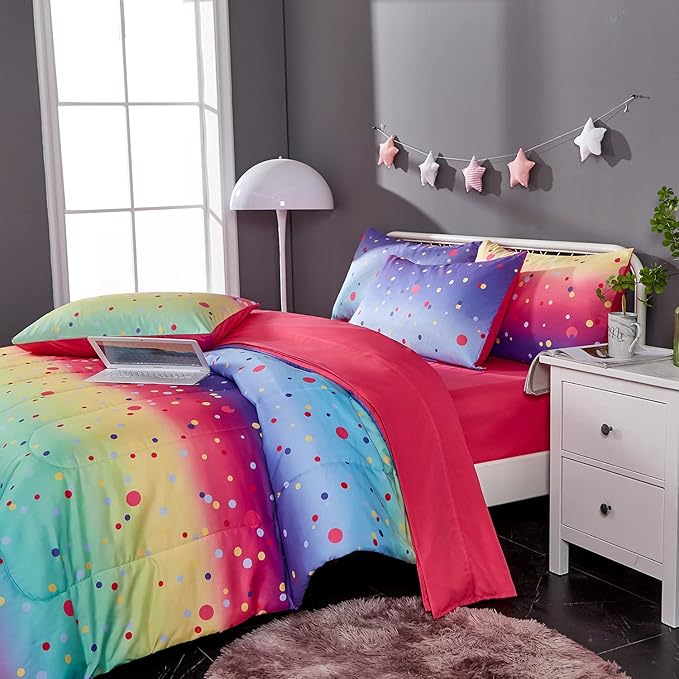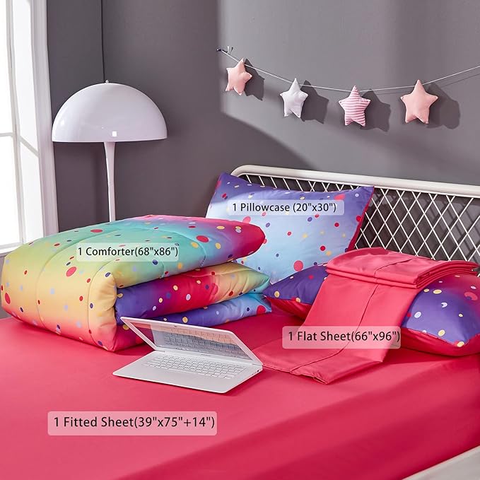 Colorful Polka Dots Rainbow Comforter Set for Teen Girls Women,Twin Size 4 Piece Bed in A Bag,Circles Printed Comforter and Sheets,Ultra Soft Microfiber All Season Bedding Set(Twin,Dots)