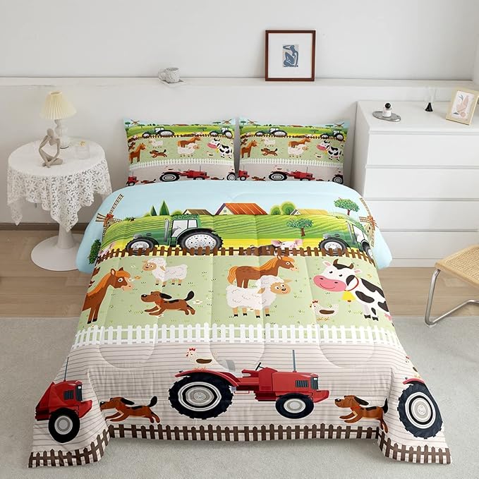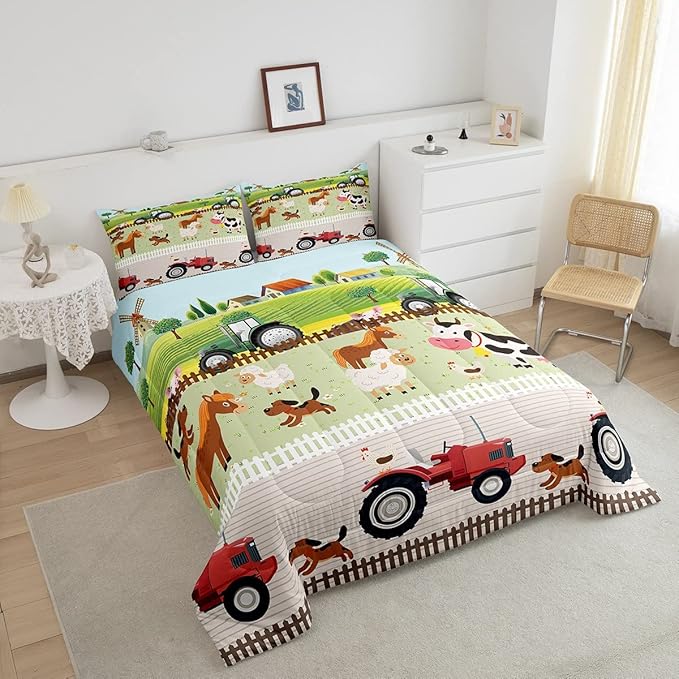 Tractor Bedding Sets for Boys Twin Size Toddler Kids Cute Cartoon Farm Animals Comforter Set Girls Children Farmhouse Country Down Comforter for All Season Colorful Room Decor Nature Theme Duvet Set