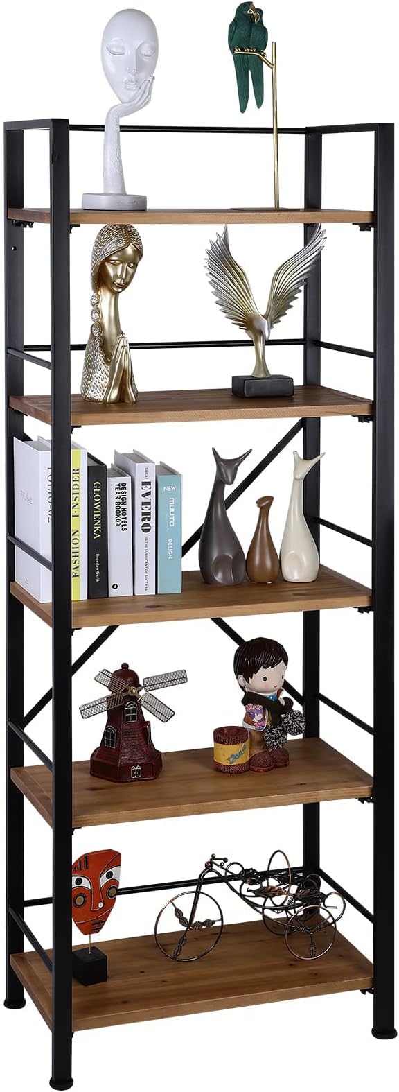 Rustic Bookshelf, 5 Tier Real Wood Bookshelf, Metal Book Shelf for Storage, Black Bookcase, 12.6" D x 23.62" W x 64.17" H