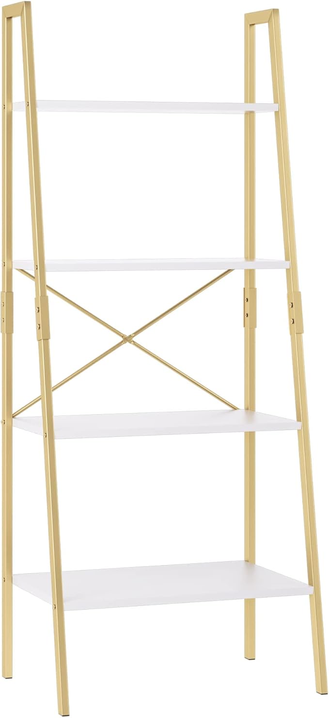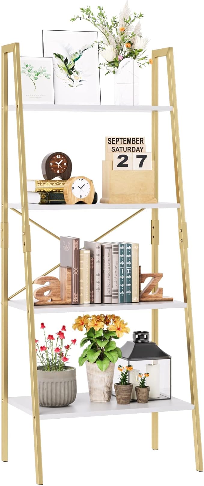finetones Bookshelf 4 Tier, Wood Bookcase with Metal Frame, Open Display Storage Ladder Shelf, Plant Flower Stand Storage Rack for Home Office White/Gold